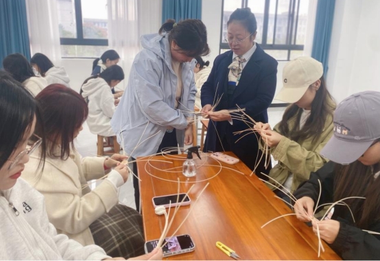活动特邀叶秋美教授担任主讲人,她通过理论讲解与现场示范相结合的方式,系统介绍了汉中藤编的历史渊源、工艺特色及文化价值,重点演示了藤编从选材、编织到成品成型的全流程技艺。在互动环节,教育类专业师生在叶老师的指导下,亲手尝试藤编基础技法,感受传统手工艺的精妙与匠心。