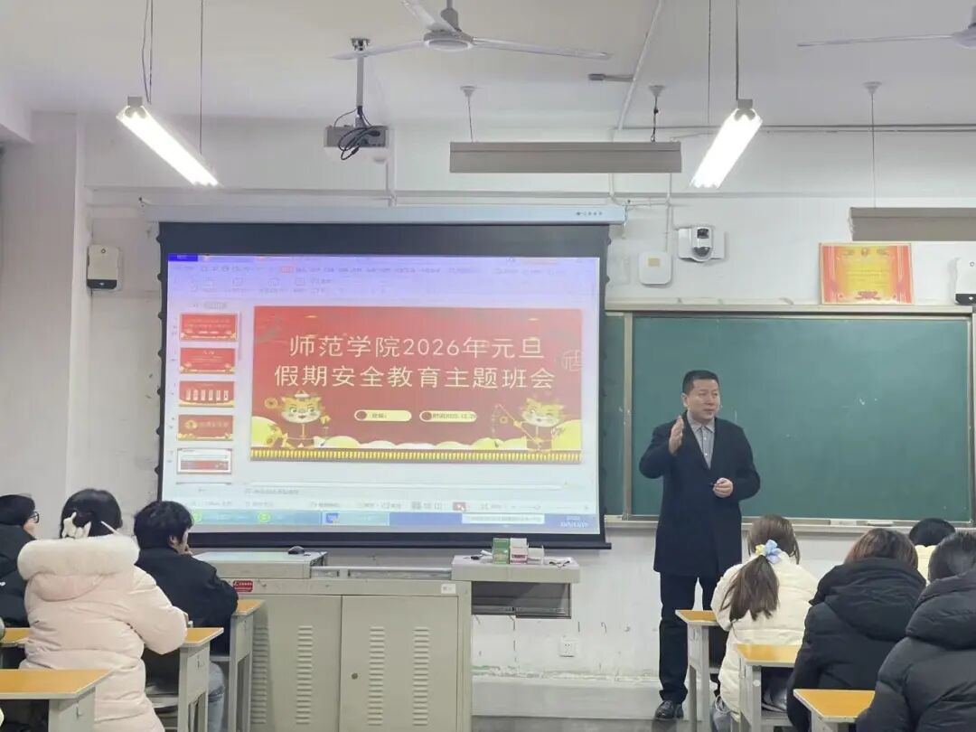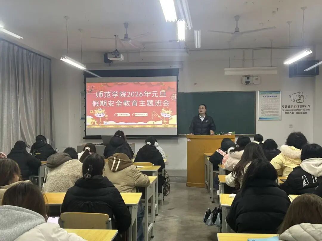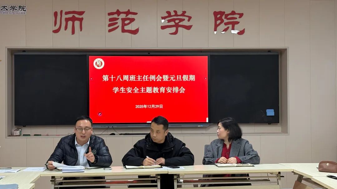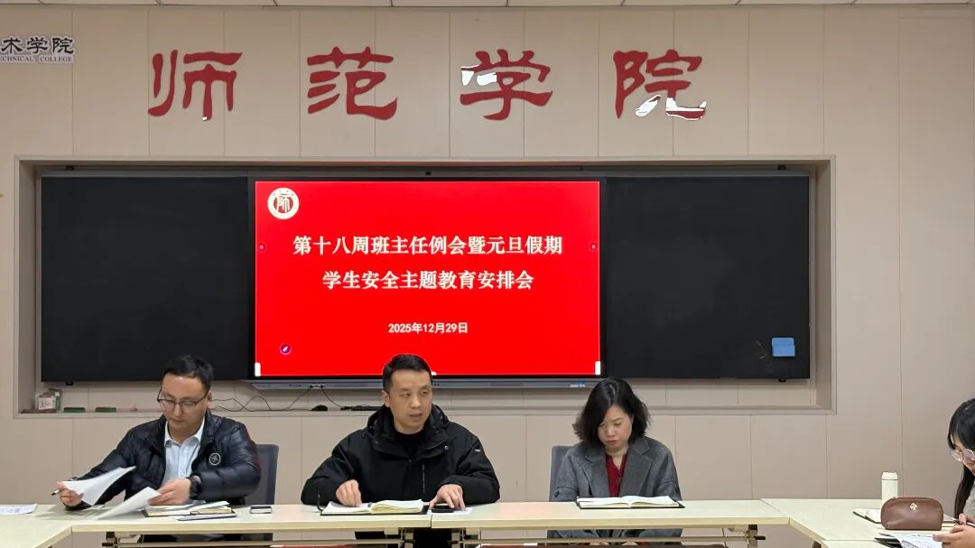 为压实期末学生管理责任,筑牢校园安全防线,保障元旦假期平稳过渡,2025年12月29日下午,师范学院组织召开第十八周班主任工作例会暨元旦假期学生安全教育安排会。师范学院党总支书记徐坤、院长秦艳红、“四进两联一交友”包联干部、全体辅导员及班主任、学管办全体人员参加了会议。