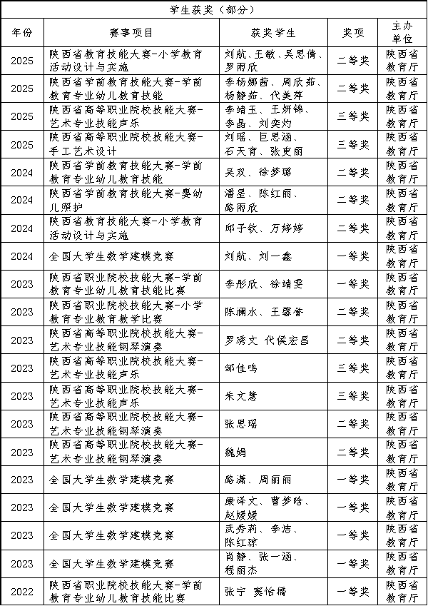 人才培养质量持续提升。近年来,学生技能水平不断提高,在技能大赛中获得国家级二等奖2项、三等奖1项、优秀奖1项,获得省级一等奖10项、二等奖26项、三等奖20项,学前教育专业技能大赛连续三年蝉联省级一等奖。毕业生参加专升本及免试认定教师资格证通过率高,就业态势好,就业率在96%以上。